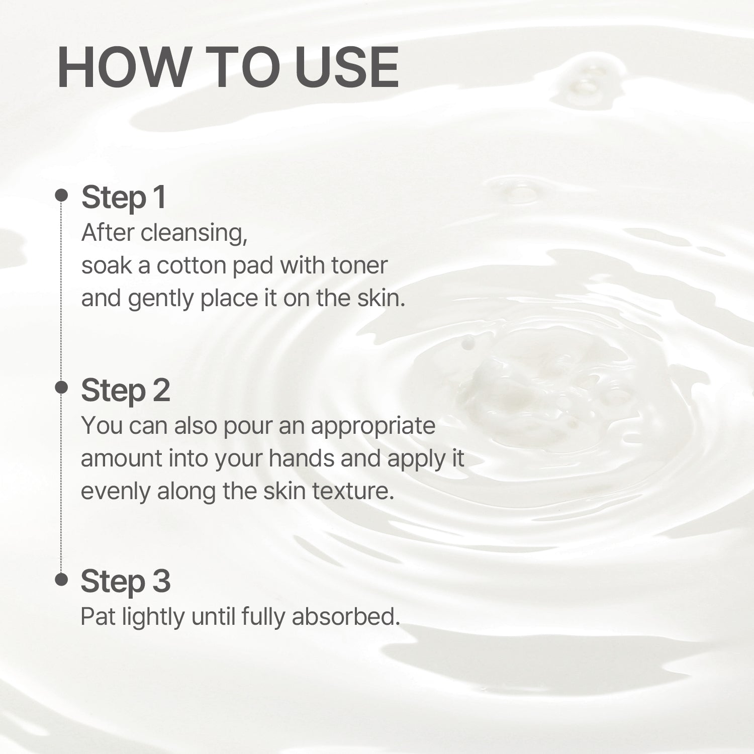 After cleansing, apply with hands or cotton pad.